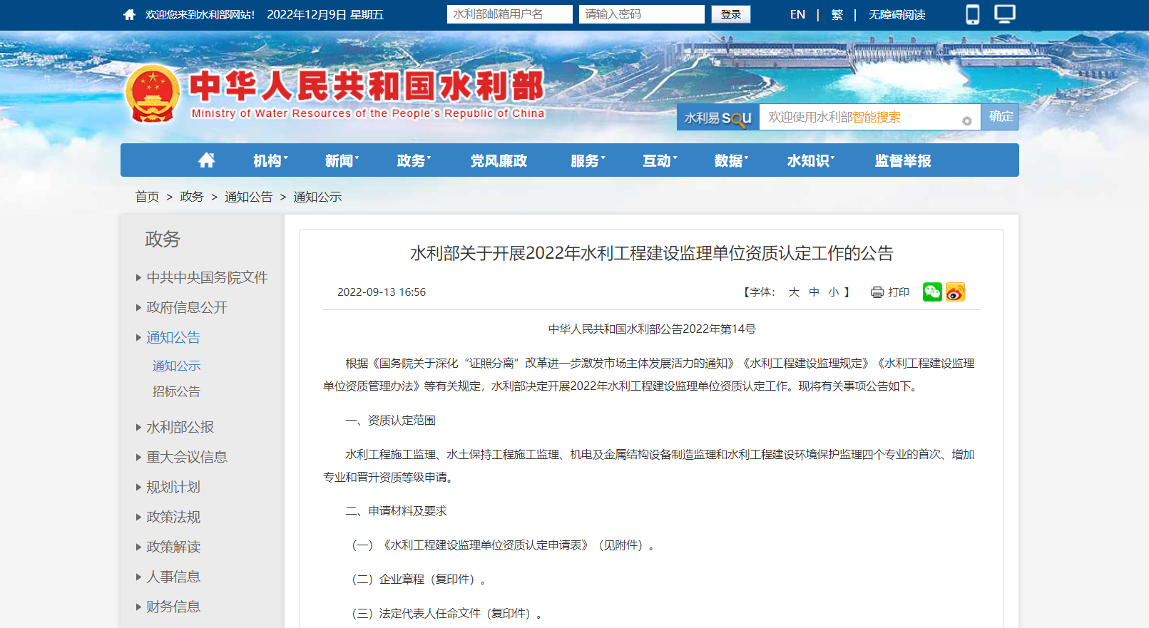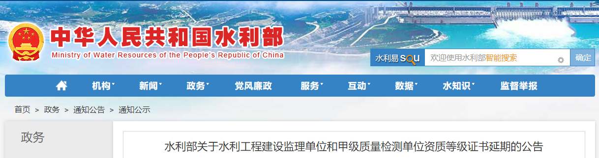 水利部關(guān)于延期接收部分地區(qū)水利工程建設(shè)監(jiān)理單位和甲級(jí)質(zhì)量檢測單位資質(zhì)認(rèn)定紙質(zhì)申請(qǐng)材料的公告 2022-12-01